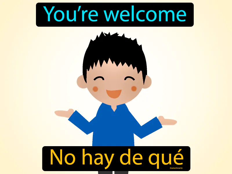 No Hay De Que: You're welcome. No hay de qu. "No hay de qu" is a common Spanish phrase meaning "you're welcome" or "it's nothing."