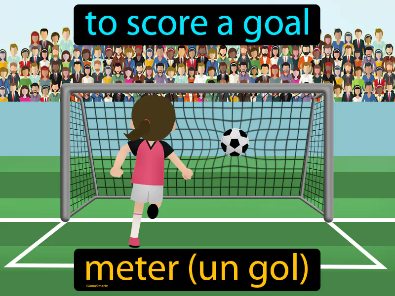The Spanish phrase "meter un gol" translates to "to score a goal" in English. To help you remember this, think of it as "meeting the goal" — because when you "meter un gol," you've literally "met the goal" of getting that soccer ball into the net! Imagine a soccer player named "Meter," who always seems to meet the net with the ball. So next time you hear "meter un gol," picture "Meter" the soccer star, always on target. ⚽️