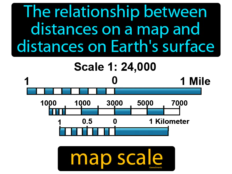 Map Scale: The relationship between distances on a map and distances on Earth's surface. Map scale. Map scale shows how much smaller a map is compared to the real world.