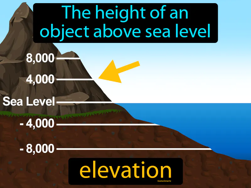Elevation: The height of an object above sea level. Elevation. Elevation is the height or altitude of a place or object measured from sea level.