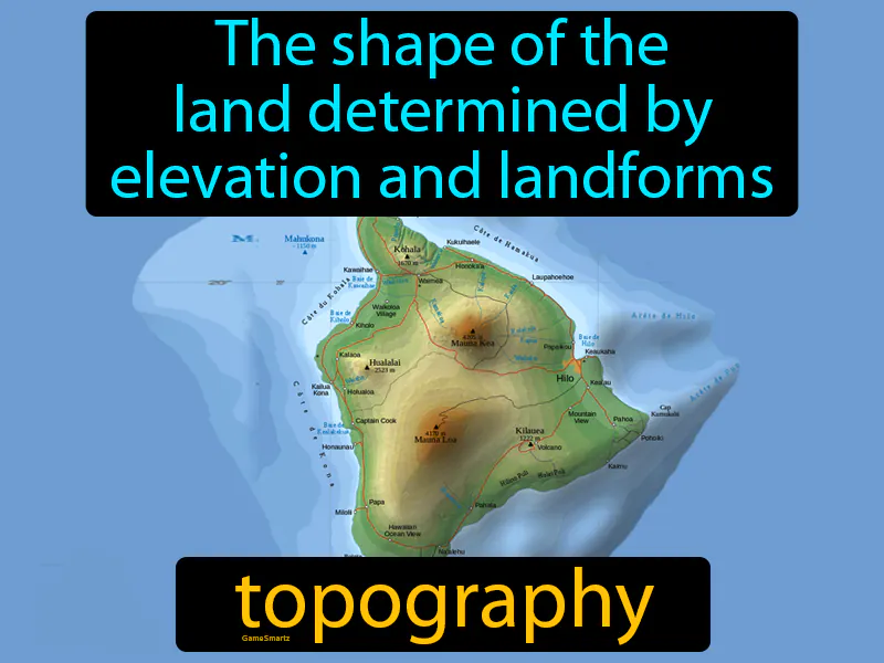 Topography: The study of the shape of the land determined by elevation and landforms like mountains, rivers, and valleys. Topography. Topography is the study of the features and shapes of Earth's surface.
