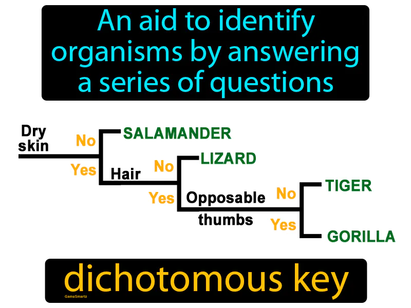 Dichotomous Key: An aid to identify organisms by answering a series of questions. Dichotomous key. A dichotomous key is a tool that helps you identify organisms by guiding you through a series of yes or no questions.