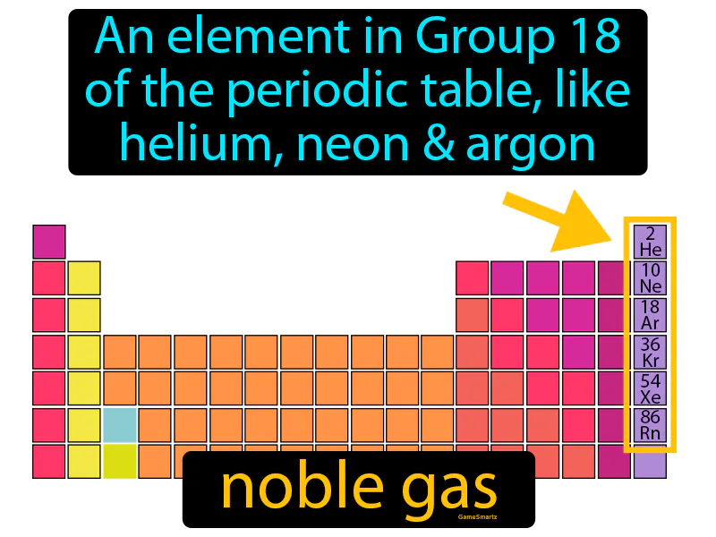 Noble Gas: An element in Group 18 of the periodic table, like helium, neon and argon. Noble gas. A noble gas is a chemical element with a full outer shell of electrons, making it very stable and unreactive.