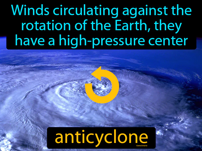 Anticyclone: Winds circulating against the rotation of the Earth, they have a high-pressure center. Anticyclone. An anticyclone is a weather system where winds spiral outward from a high-pressure area, often bringing clear skies.