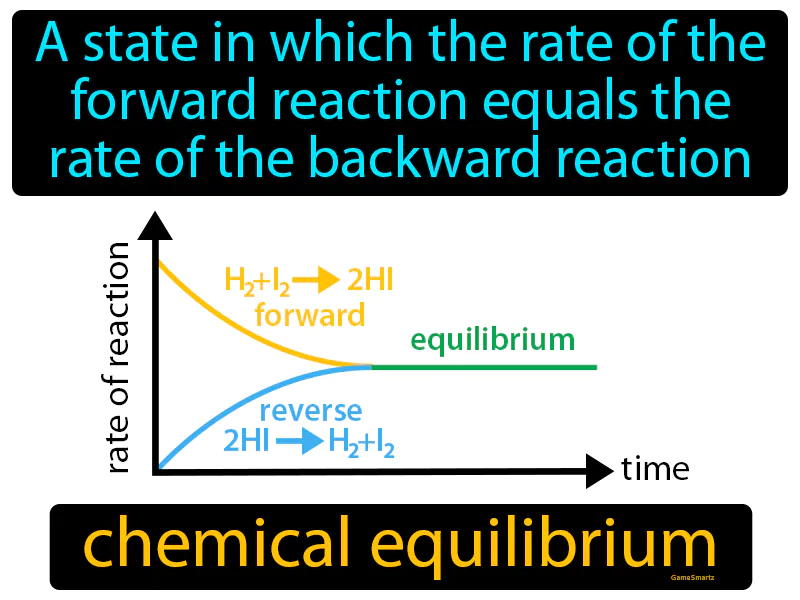 Chemical Equilibrium: A state in which the rate of the forward reaction equals the rate of the backward reaction. Chemical equilibrium. Chemical equilibrium is when a chemical reaction has balanced out so that its products and reactants remain constant over time.