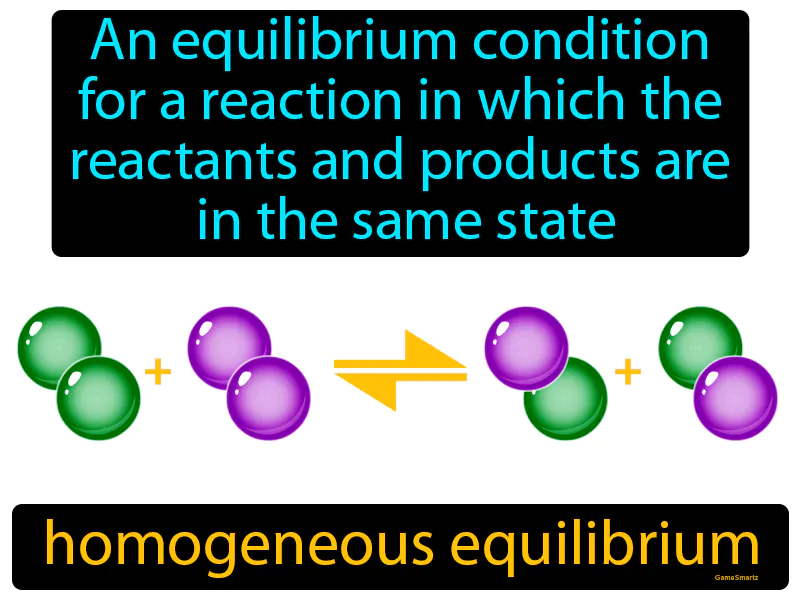 Homogeneous Equilibrium: An equilibrium condition for a reaction in which the reactants and products are in the same state, solid, liquid, or gas. Homogeneous equilibrium. It occurs when substances in a chemical reaction are all in the same physical state.