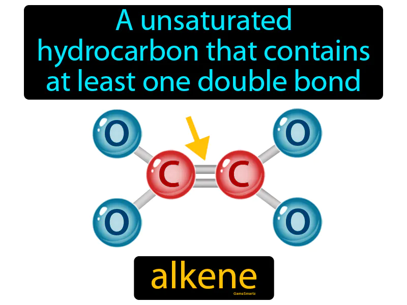 Alkene: A unsaturated hydrocarbon that contains at least one double bond. Alkene. Alkenes are hydrocarbons with at least one carbon-carbon double bond, which makes them more reactive than alkanes.