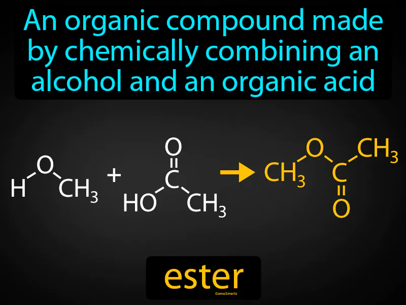 Ester: An organic compound made by chemically combining an alcohol and an organic acid. Ester. An ester is a chemical compound that often has a pleasant smell and is used in making fragrances and flavors.
