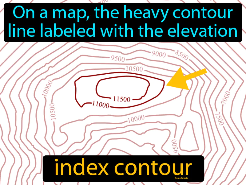 Index Contour: On a map, the heavy contour line labeled with the elevation. Index contour. An index contour is a thicker line on a map that shows elevation and helps you easily identify height levels in terrain.