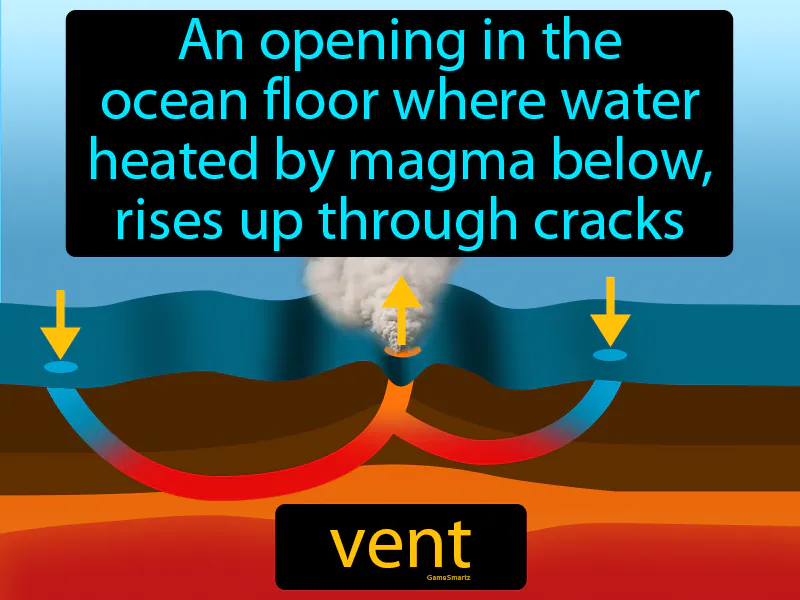 Vent: An opening in the ocean floor where water heated by magma below rises up through cracks. Vent. A vent is a spot where heat from inside the Earth escapes through the ocean floor.