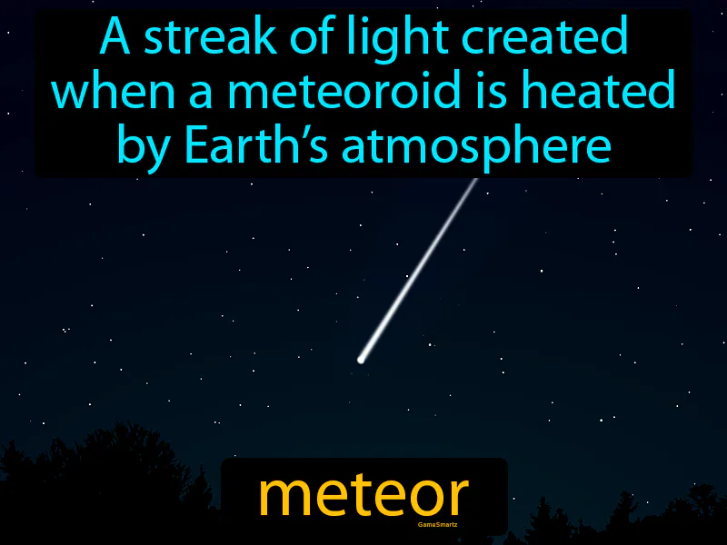 Meteor: A streak of light created when a meteoroid is heated by Earths atmosphere. Meteor. A meteor is a bright trail in the sky formed when a space rock burns up entering Earth's atmosphere.
