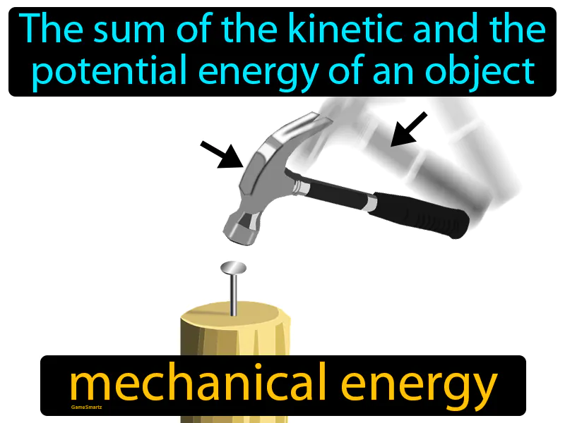 Mechanical Energy: The sum of the kinetic and the potential energy of an object. Mechanical energy. In simple terms, mechanical energy is the energy that an object has because of its motion or position.