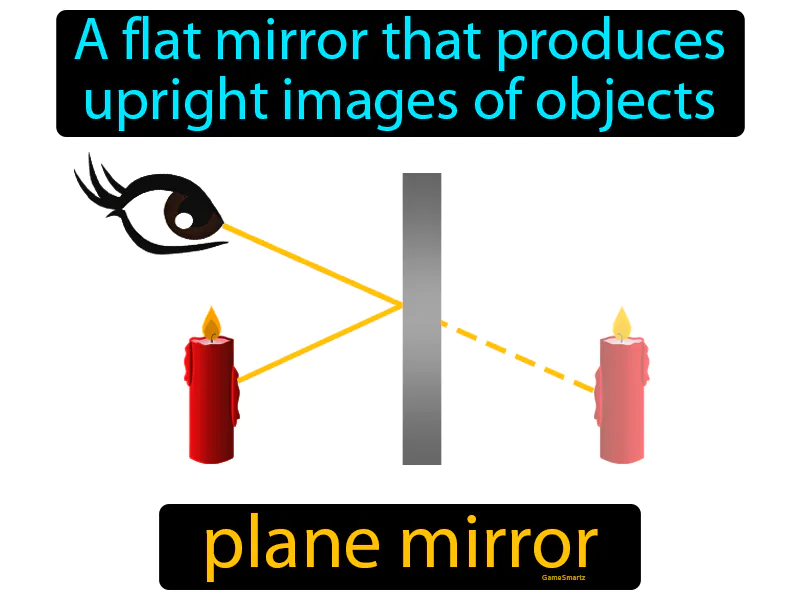 Plane Mirror: A flat mirror that produces upright images of objects. Plane mirror. A plane mirror is a smooth, flat surface that reflects light evenly, creating a clear image right-side up.