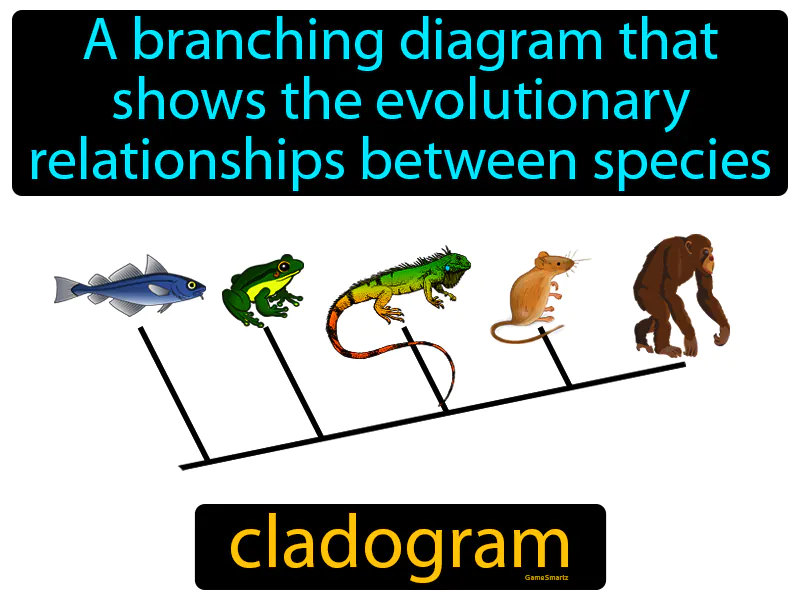 Cladogram: A branching diagram that shows the evolutionary relationships between species. Cladogram. A cladogram is a chart that shows how different species are related based on their evolutionary history.