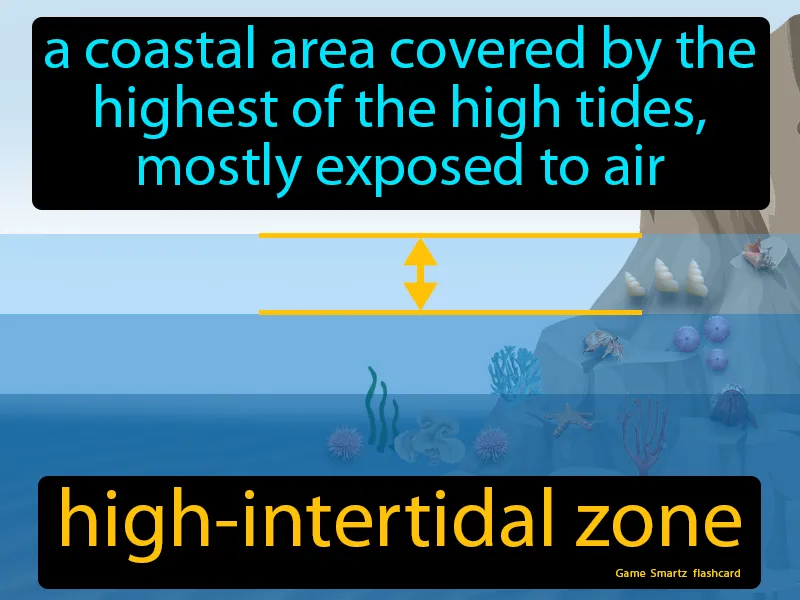 High-intertidal Zone: A coastal area covered by the highest of the high tides, mostly exposed to air. high-intertidal zone. The high-intertidal zone is the part of the shore that gets covered by the sea only during the highest tides.