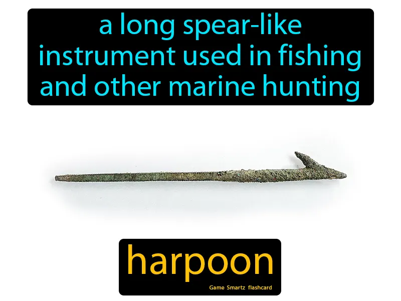 Harpoon: A long spear-like instrument used in fishing and other marine hunting. Harpoon. In simple terms, a harpoon is a tool that is thrown or shot to catch large marine animals like whales or fish.